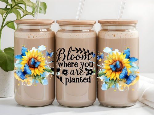 🦋 Clear Glass Can with Butterflies and Sunflowers – Inspirational Quote: "Bloom Where You Are Planted"