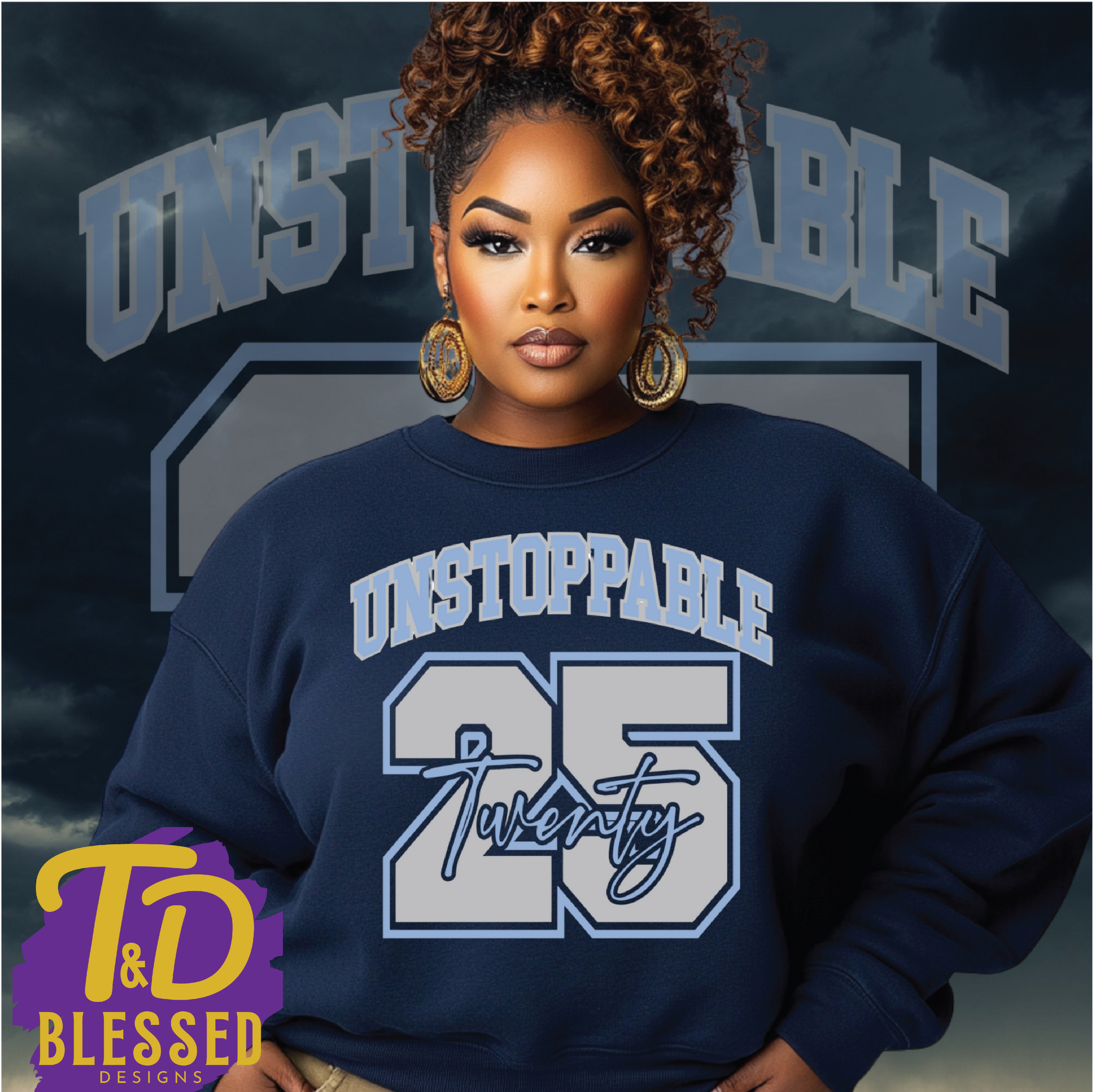 The bold "Unstoppable 25" graphic design adds a touch of motivation and flair, making it a great statement piece for anyone ready to take on the world in 2025.